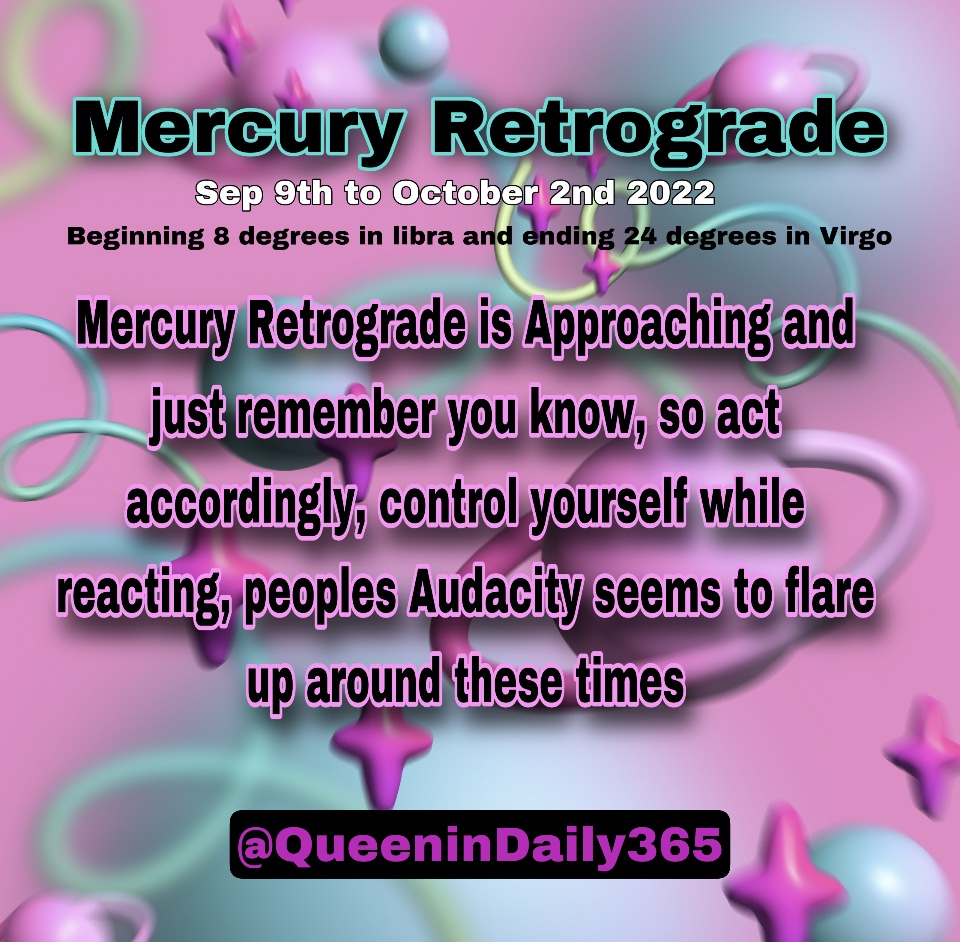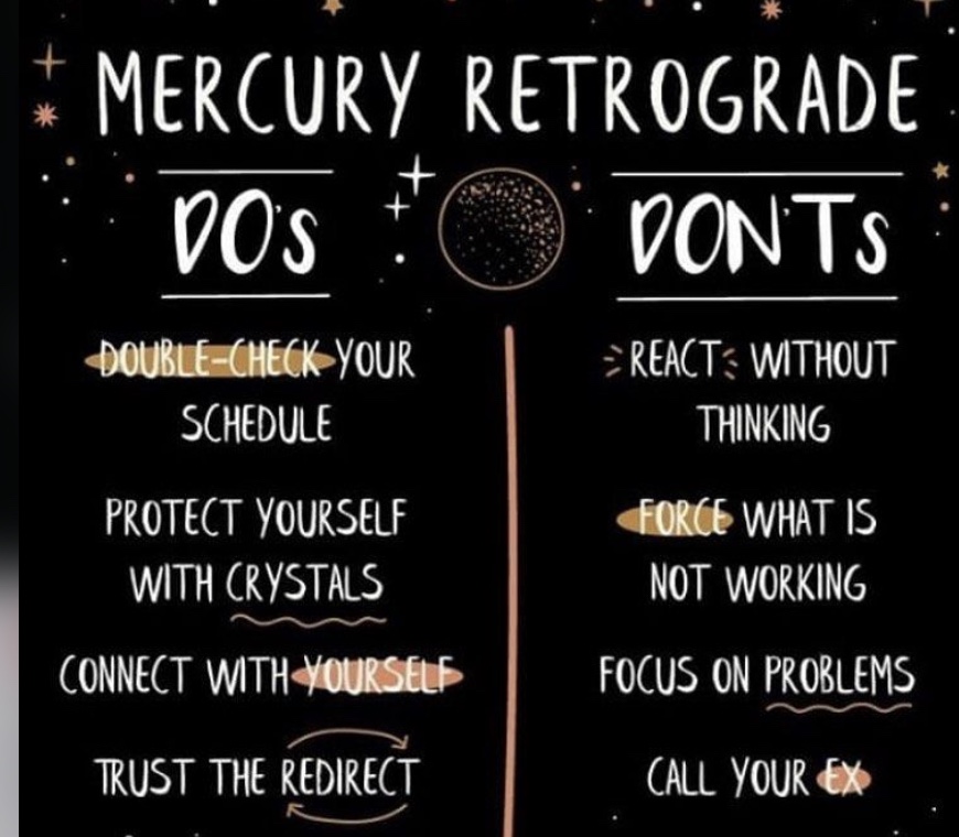 Control is key, the fact that you are aware will give you an upper hand in how you look at certain, situations and interactions. If you expect people to act odd, doing things that they don’t normally do, or if your finances are looking like they may dip, remember this is just the retrograde shaking things up, if you Truly understand things run smoother, mentally especially because you already know by the end of Retrograde things will be better than they start, think of Mercury retrograde as a bunch of test and each time you don’t react negatively you have won that level.